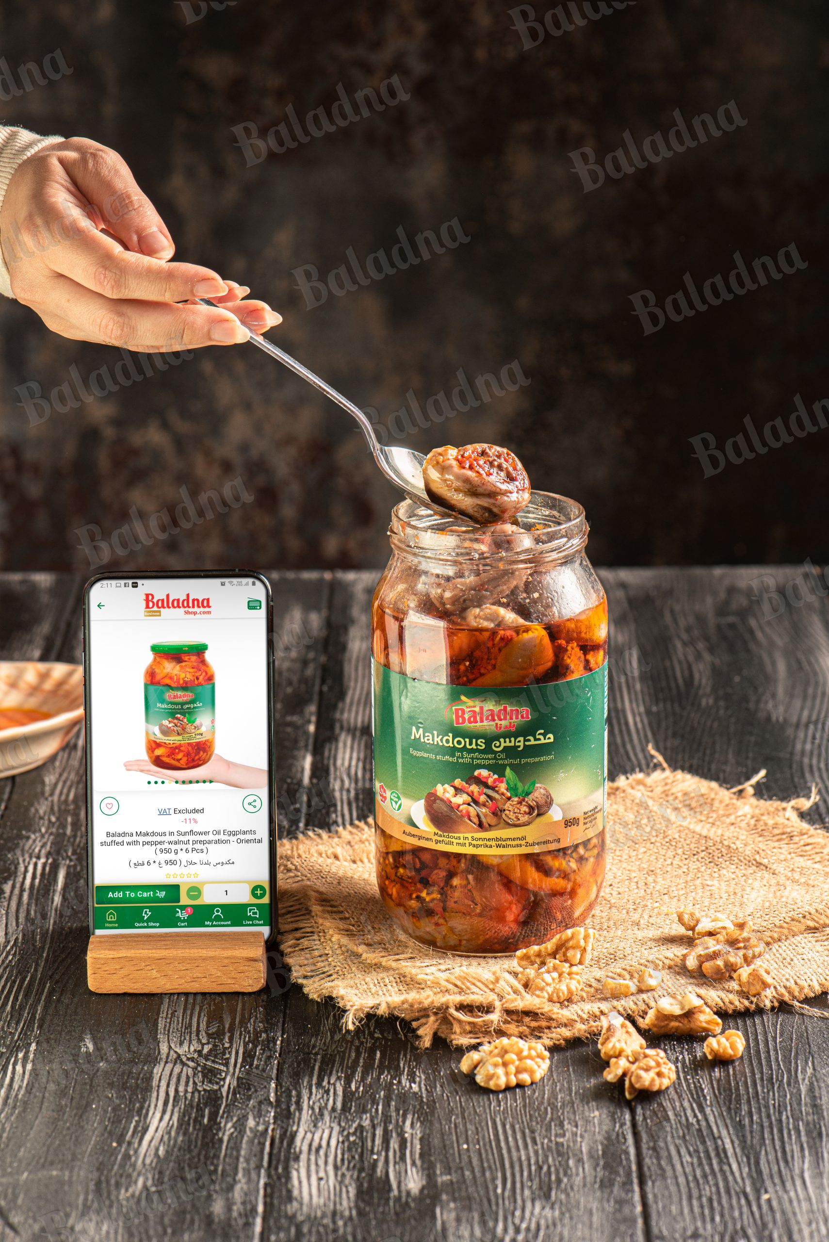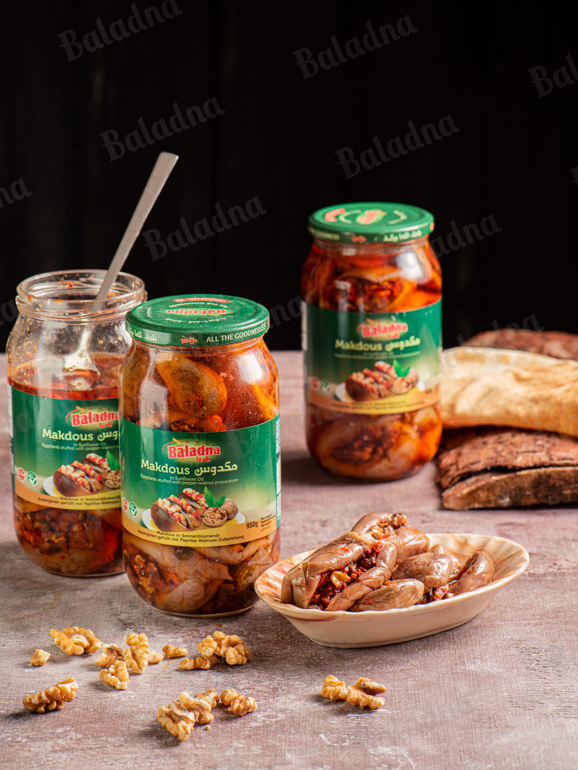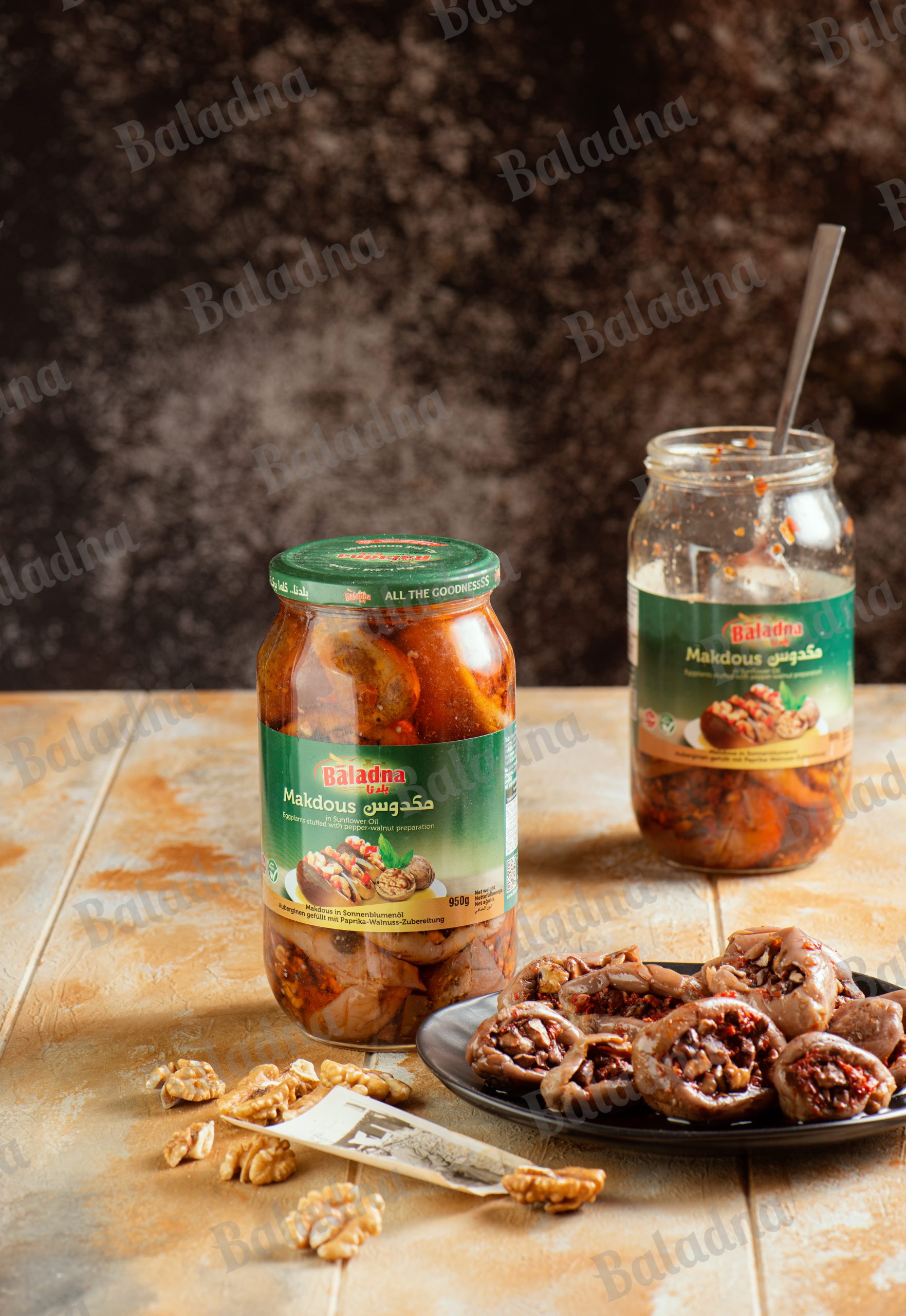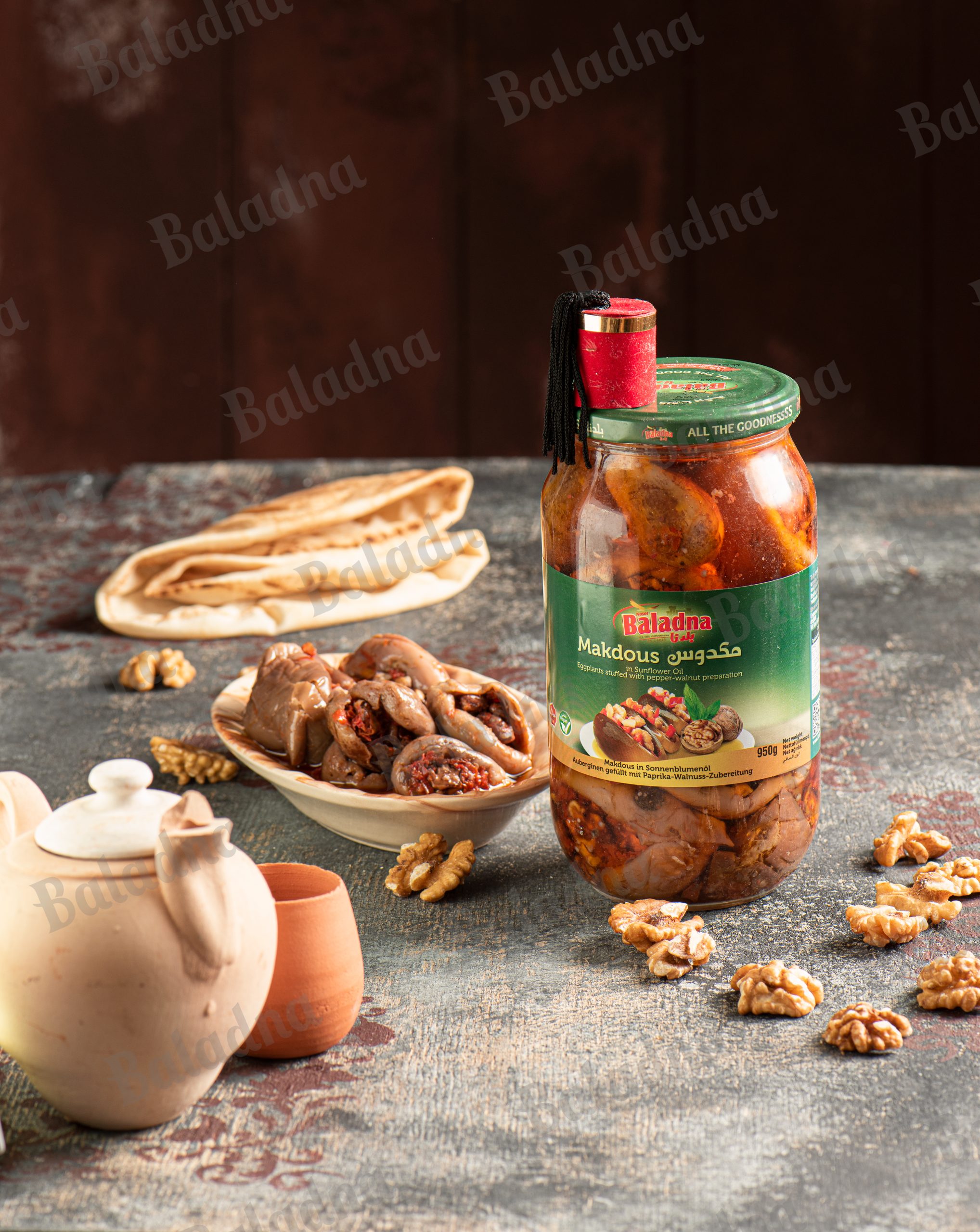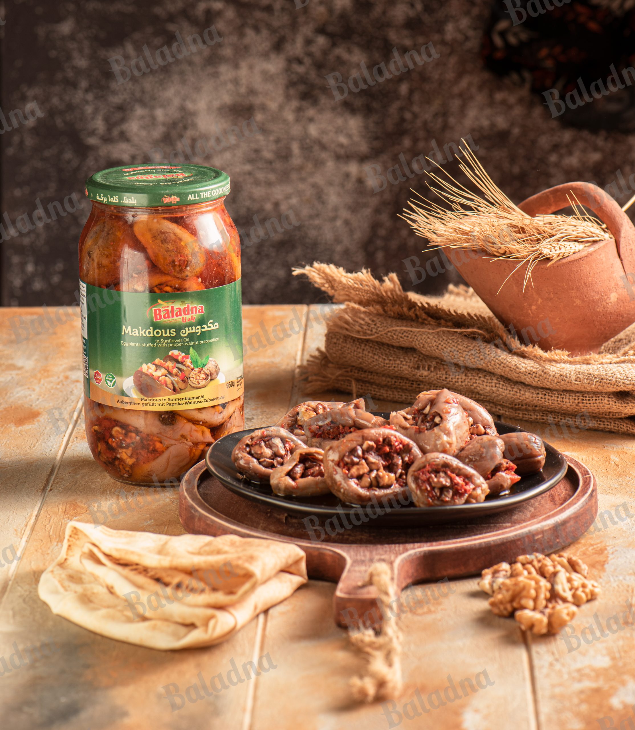 يعتبر المكدوس من الأكلات الشعبية في المنطقة العربية وبنيت عليه الكثير من القصص والحكايات، وعادة ما تنفرد بتحضيره الجدات والسيدات المسنات، حيث يتطلب تحضيره الكثير من الصبر والحب والشغف، بالطريقة التقليدية قطعة قطعة، ولذلك فهو إصدار محدود لا يتوفر بكميات كبيرة. يأتي في 3 أحجام في عبوات زجاجية (صغيرة ومتوسطة وكبيرة) . هذا المنتج نباتي ونباتي وخالٍ من اللاكتوز والغلوتين. تبدأ الحكاية بقطف حبات الباذنجان الصغيرة من نوع معين من الباذنجان في أيام معينة من الموسم (30 يوم)، حيث يتم حفره وغليه حتى ينضج ثم يتم عصره بمكابس ثقيلة للتأكد من خروج كل الماء منه، ثم يتم حشوه بالمطحون الطازج اللذيذ الطازج والفلفل ويضاف إليه المكسرات المقطعة الطازجة، ثم يصب عليه زيت الزيتون الطازج الفاخر ويبقي على هذا الحال لأسابيع حتى ينضج تماماً . جاهز للأكل، ويقدم في وجبتي الفطور والعشاء ويعتبر من الأطباق الشعبية ويمكن تقديمه كمقبلات، ويمكن اعتباره طبقًا رئيسيًا في وجبتي الفطور والعشاء. .