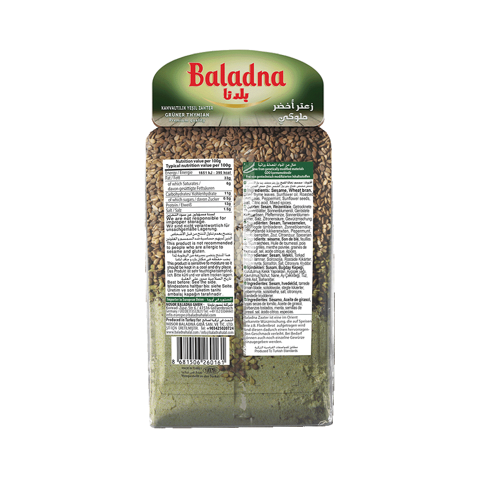 It is one of the distinguished products in Baladna, as thyme is a mixture of wild green thyme powder added to sumac, sesame and many other Arab spices, where the proportion of sesame is approximately 50%, which gives a high nutritional value, and green thyme is one of the aromatic herbs Distinctive, which provides high nutritional value in addition to ‘a distinctive taste. The city of Aleppo is famous for the manufacture of thyme for thousands of years, and tourists often buy thyme as a souvenir from the city of Aleppo, where the thyme of Aleppo is the most famous in the world . Available in two sizes, a family size of 500 grams, and a small size of 60 grams . This product is Vegan, vegeterian, and lactose free . . It is ready to eat after the contents of the bag are mixed well It is usually served alongside olive oil, where it is eaten in Oriental bread and prepared from it thyme and thyme sandwiches, and it is sometimes added to the chicken seasoning before it is placed in the oven. Other several recipes are prepared using thyme, and it is available in several flavors, including royal green thyme, Aleppo thyme with sumac and thyme with pomegranate flavor. . It is known to make a sandwich for children for schools in the Middle East because it contains high nutritional values, which is a child-friendly food.