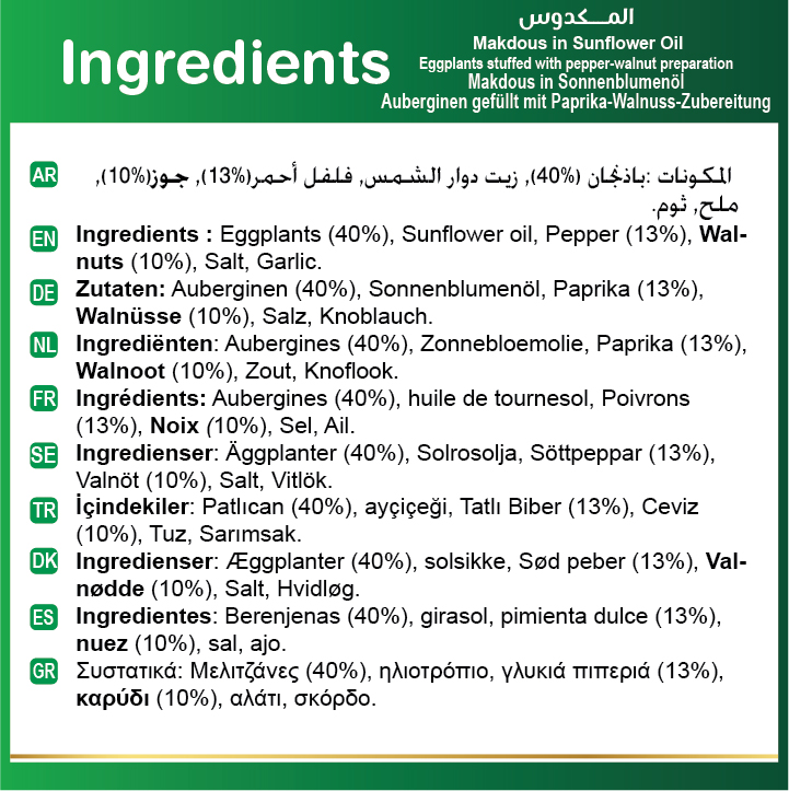 Makdous is considered a popular food in the Arab region and many stories and tales were built upon it, and it is usually unique to preparing by grandmothers and elderly ladies, as its preparation requires a lot of patience, love and passion, in the traditional way, piece by piece, and therefore it is a limited-edition with no large quantities available. It comes in 3 sizes in glass bottles (small, medium and large) . . This product is Vegan, vegeterian, lactose free and gluten free . the story begins with picking small eggplant beads from a certain type of eggplant at certain days of the season (30 days), when it is dug and boiled until ripe and then pressed with heavy presses to make sure all the water comes out of it, and then it is stuffed with freshly tasty ground, peppered, and added to it the freshly cut nuts, and then doused it with luxurious fresh olive oil and Keep it this way for weeks until it is completely ripped. . Ready to eat, served at breakfast and dinner and considered a popular dish and can be served as an appetizer, and can be considered as a main dish for breakfast and dinner. .