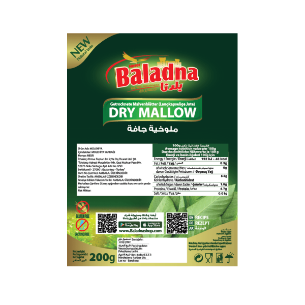 Baladna Molokhia is one of the best types of Molokhia, and it is a popular dish in the Arab and the Eastern Region, and it is considered one of the distinctive cooks, and one of its names is The Royal, since in 1805 the king issued a decree banning the common people from eating Molokhia and confining it to the royal palace at the time, and it became its kingship name. Baladna Molokhia is special that it is a fresh crop that is watered with clean water and harvested and purified with care, and then dried under sunlight in the traditional natural way without any industrial interventions, and it is packed with a transparent fully sealed bag inside a carton box to prevent the leaves from breaking. . It is suitable for vegan and vegetarians as it is a very important source of fiber and iron, especially after adding lemons once it is ready. . This product is Vegan, vegeterian, lactose free and gluten free . How to prepare: 1. Mallow leaves are gently washed with water and then filtered from water 2. Set on low heat, stirring gently 5 minutes 3. Obesity is added to Molokhia and roasted for 15 minutes 4. Roast garlic and coriander with obesity in a separate bowl and add it to the roasted Molokhia. 5. Add boiled chicken and water until the water is covered with Molokhia leaves and salt is added as desired. 6. Leave on low heat and stir every 10 minutes for an hour. 7. Add the juice of half a lemon in the last 5 minutes and stir well. 8. The dish is ready to be served. . It is distinguished by its wonderful green color and with its full leaves, and it can be presented in the form of leaves or milled to be cooked in a soup-like shape. . It can be served with or without rice.