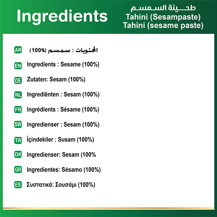 Tahini is prepared from the finest types of Sudanese sesame, “cartilage”, which is known as the best kind of sesame globally. It goes through different processes, and traditionally squeezed on white stones to give pure original tahini without any additions, which makes it distinct from other types of tahini. . The pack should be shaked at every use, ensuring that no residue remains at the bottom of the pack, just like other types of tahini which are available on the market. Tahini is distinguished by its high nutritional value, creamy color, and great coherent texture. . This product is Vegan, vegeterian, lactose free and gluten free . Prepared from the finest types of Sudanese sesame, “cartilage”, which is known as the best kind of sesame globally. It goes through different processes, and traditionally squeezed on white stones to give pure original tahini without any additions, which makes it distinct from other types of tahini. . Tahini is usually added to many dishes during preparation, and it is also prepared as a sauce as a component in preparing different types of sandwiches and is presented in elegant plastic packages, available in small and medium sizes. Among the most important dishes that come with the tahini is the Mutabal, which is the king of starters and appetizers, where the tahini is added to the roasted eggplant, a little garlic and lemon. .