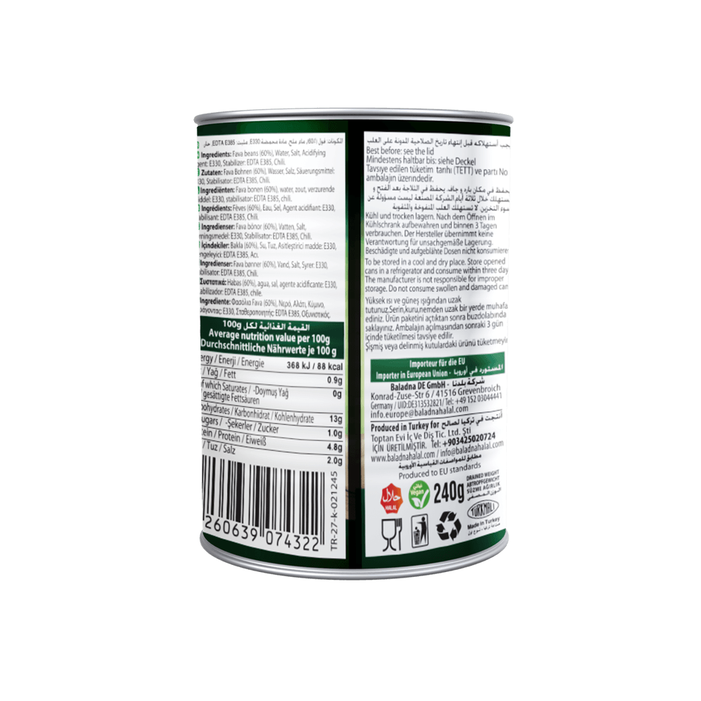 Beans are considered one of the most popular dishes in the Arab and Eastern Region. They are eaten by old, young, rich and poor people. It is considered a main daily meal in some Arab countries. It can be kept in the refrigerator for several days after opening. . Baladna beans are prepared from the finest types of fresh bean crops, from a completely cooked yellow bean to be prepared in the traditional way with the latest industrial machines that use the best industrial methods for producing conserve . This product is Vegan, vegeterian, lactose free and gluten free . It comes in tins that are easy open and is ready to eat and does not need any preparation. It is usually served in a dish, with some olive oil i added to it along with some vegetables (tomato, mint, parsley) next to it. . It is served as a salad dish after adding olive oil, onions and a few tomatoes (as desired), and it is considered an important source of protein, especially for vegetarians and vegans, and gives a feeling of satiety for a long time. .