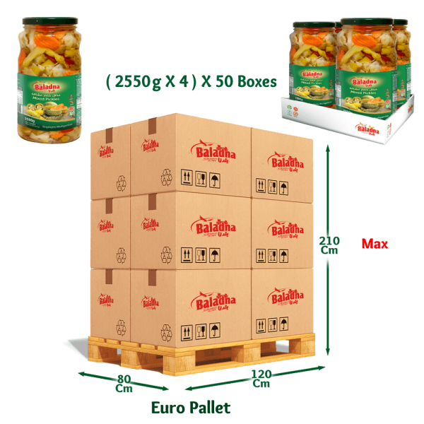Pickles are dishes that exist on most tables with most meals in the culture of the Arab and oriental cuisine and are distinguished by their sour and salty taste, and are made of several types of vegetables, the most important of which are cucumbers, wild cucumbers, peppers, cabbage and other types of vegetables, and packing could be of single item or multiple items. Pickles come in whole or chipped pieces, and are also used as a main ingredient in sandwiches . Baladna pickles come in several sizes (small, medium and large) with different types of vegetables, such as cucumbers, wild cucumbers, peppers, and other types to suit different tastes. It should be placed in a cool place to maintain its consistency for a long time Ready for eat and does not require any preparation . This product is Vegan, vegeterian, lactose free and gluten free . Pickles to be washed and served with a dish alongside food and do not need to be prepared as they are ready for eat . Pickles to be washed and served with a dish next to the food, it can also be served as whole or small pieces or slices, it can also be an innovative dish by cutting it, adding some oil, cumin and finely chopped onions (as desired), and you can add fresh tomatoes to form a unique platter of salad to be eaten alone or alongside other dishes .