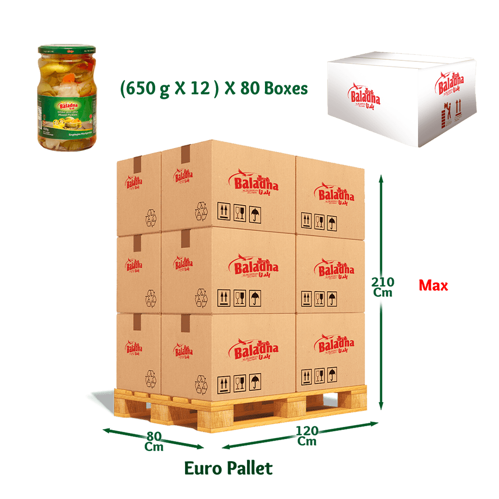 Pickles are dishes that exist on most tables with most meals in the culture of the Arab and oriental cuisine and are distinguished by their sour and salty taste, and are made of several types of vegetables, the most important of which are cucumbers, wild cucumbers, peppers, cabbage and other types of vegetables, and packing could be of single item or multiple items. Pickles come in whole or chipped pieces, and are also used as a main ingredient in sandwiches . Baladna pickles come in several sizes (small, medium and large) with different types of vegetables, such as cucumbers, wild cucumbers, peppers, and other types to suit different tastes. It should be placed in a cool place to maintain its consistency for a long time Ready for eat and does not require any preparation . This product is Vegan, vegeterian, lactose free and gluten free . Pickles to be washed and served with a dish alongside food and do not need to be prepared as they are ready for eat . Pickles to be washed and served with a dish next to the food, it can also be served as whole or small pieces or slices, it can also be an innovative dish by cutting it, adding some oil, cumin and finely chopped onions (as desired), and you can add fresh tomatoes to form a unique platter of salad to be eaten alone or alongside other dishes .