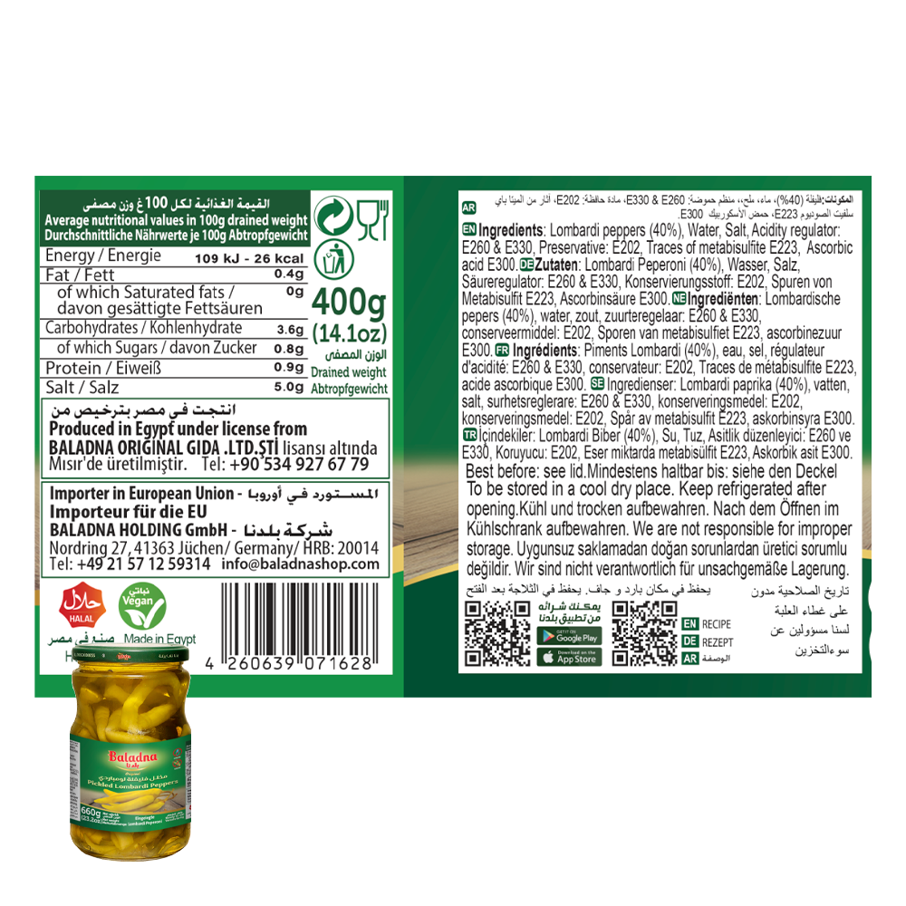 Baladna Pickled Lombardi Peppers – Oriental 660 g